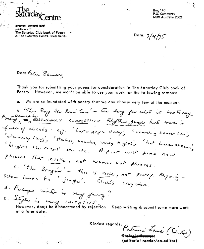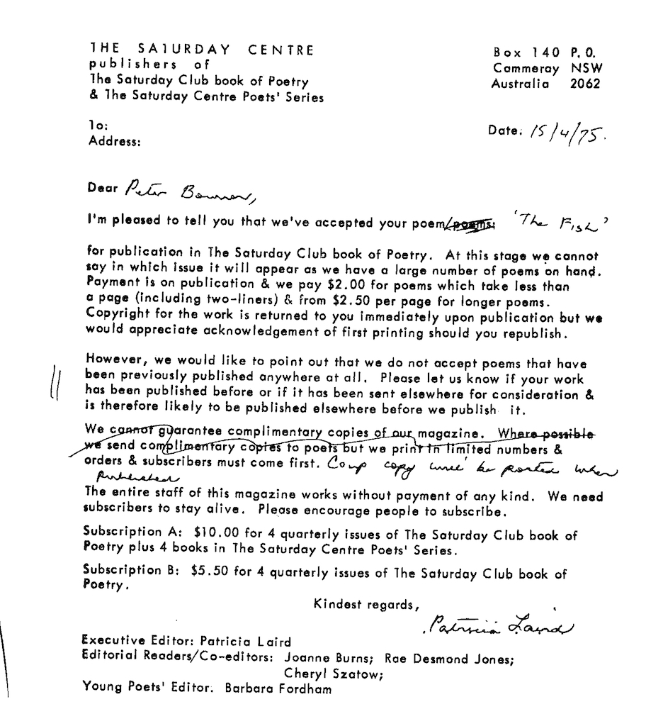 This poem is true to one of my concerns then and now - heedless destruction of the environment. The tragedy of the Exxon Valdiz was still 14 years in the future - foreseeable in one form or another to anyone with open eyes. Profits make it easy for many to walk with a white cane. Sometime in March or early April, 1975, I had sent off two poems for consideration by a local poetry magazine. A letter of rejection was received, dated April 7th. “The Day The Rains Came” centred around the biblical flood, told as a reminiscence by someone as the rains start falling. Interwoven paragraphs contrasted a previous drought and its consequences with the start of the rains. The words were deliberately those of a common person, and in keeping with the drought, dry. They liked the rhythmic patterns I had created, but thought the language was pervaded with cliche - which it was, but that was half the point. “The Dragon” was a “simple” exercise of writing in a traditional style - fixed meter and rhyme scheme in a time when Tolkien was king to many undergraduates - Lord Of The Rings was commonly read and discussed, certainly among many at Sydney University in the mid 70’s. The criticism was that it was too “jingly” and derivative, as merely versification. I’m happy to wear the derivative, but jingly versification? Oh, like Shakespeare and Keats, Gerard Manly Hopkins and Wilfred Owens? I guess I’d wear that too, had it been intended, and had the verse been worthy. It wasn’t, but I didn’t think it was trash either. Well, it was their magazine, not mine, so I bought a copy, ruminated on the stylistic things they had accepted and, presumably, admired. Then I wrote “The Fish.” It’s a poem I have some pride in, because it said a little about something that is important to me and should be important to others. Had I not been angry enough to think “them’s fighting words” in response to the previous rejection, I might have written a different poem in response, which would also likely have been rejected. So I set out to write something that I was fairly certain they would accept. To prove to myself that I could write to a target audience. I don’t remember how much time I spent writing it, but it can’t have taken long. Because the reject slip was dated on the 7th, a Monday. At best I would have received it that evening, more likely it would have taken 24 hours to get to me, perhaps 48. The poem was conceived, written, edited, typed, and sent off. The acceptance letter is dated the following Monday, 14th of April. I’d made my point, but I expect it was over their heads! Sadly, karma had the final word. The magazine went under financially before the edition containing “The Fish” was published. So no published poem, no payment of the princely sum of $2 at the time, but that would probably get you several litres of petrol back then. Perhaps the moral was that the audience wanted something different from what the editors were publishing. Perhaps they wanted something “jingly.”