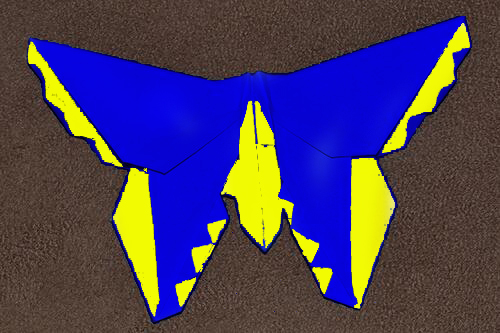 I don't have a photo of the butterfly as described, but attached is a model originlly in light and dark blue - and I've "coloured it in" (badly). I'll try to make a more accurate picture, but that little touch was not "true history", just embroidered from the fact that I folded many origami models for her, including butterflies.