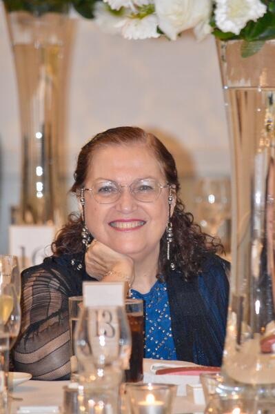 She often looks her best in red. Tonight she highlights just her lips, the rest is blue. The chandelier seeks out her eyes with light, her sapphire drops, her azure blouse shine through.